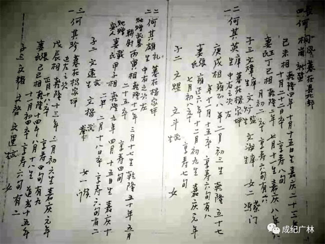 《何氏家谱》内容单一,全谱除上述3篇序文外,其余皆记述族人属相、生卒葬地、妻子儿女情况。如: