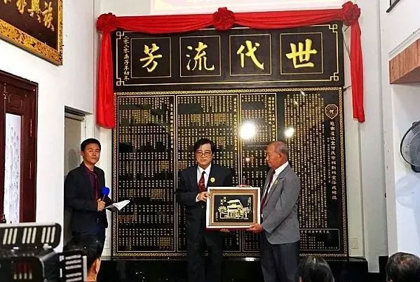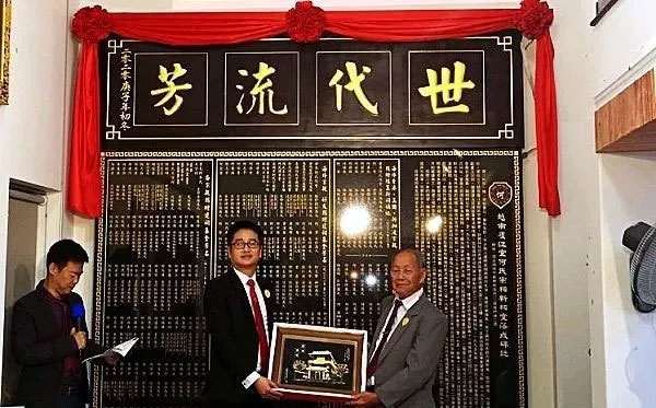 何沛坚才老族长(右)给何冠忠理事长(左)