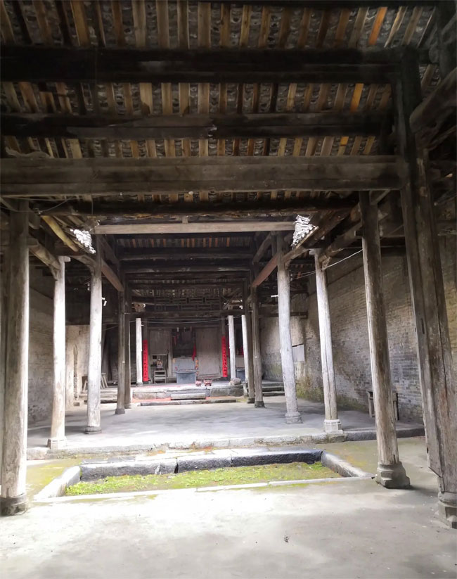 天井用于采光和纳水,古人对天井出水的方位十分讲究,强调“静阴静阳”。他们认为“阳向水去阳,富贵得又长;阴向水去阴,代代斗量金”。由于宗祠面向巽山,天井的去水方位在癸,巽属阴木,癸属阴水,阴向阴水,达到了静阴静阳的风水哲理。这在风水学上被称为“四水归槽”,寓意财源广进、福泽绵长。这种布局不仅增强了宗祠的实用性,也寄托了何氏家族对子孙后代的美好祝愿。