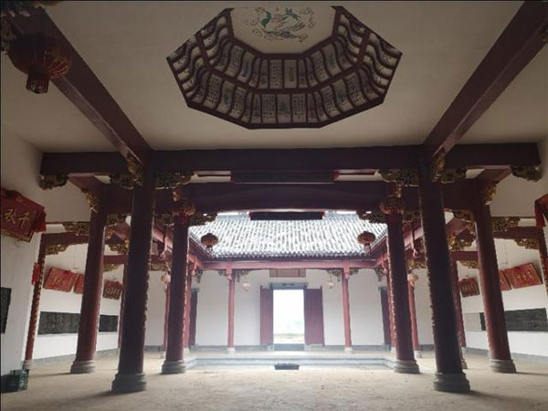经测,祠堂坐向为辛戍之间界缝,左水到右,癸丑水上堂,水出丙午,原祠堂前前开金星形大池塘,现不复存在。我们走进宗祠内,一切崭新,显然重修,为三进式两天井,天井放乙水。