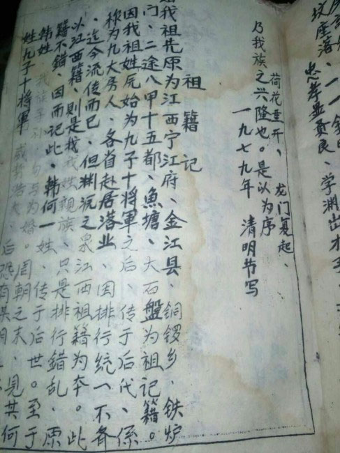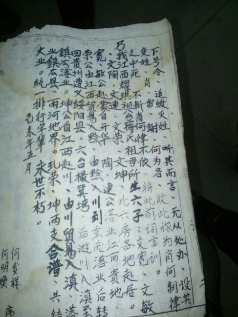 文坤祖由江西赴川由川入滇落业云南镇雄雨河地界落业,现文荣公与文坤公两房联系记载相同己合谱。