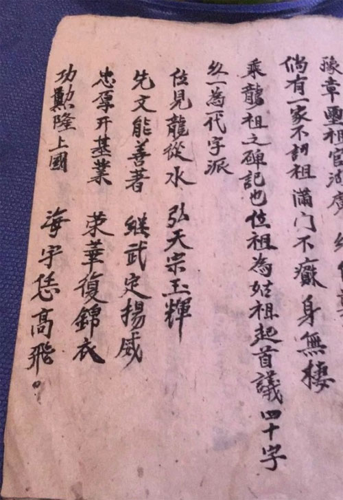 位见龙从水,弘天宗玉辉。先文能善著,继武定扬威。忠厚开基业,荣华复锦衣。功勋隆上国,海宇凭高飞。” 后40个辈字与叙永县麻城乡现榜村何氏所记只有两字之别。 根据与何勇交流,他的谱名实际是述字辈,“著”当为他祖父的笔误。“著述”为常用词,想写“述”而误书“著”,这种人脑反应出错是完全可以理解,每个人都会体验过吧?!而“玉”当为“汝”之音误! 前32个辈字是徐艺元文中没有提及的,与何松提供的则基本相同。 何勇提供的信息是何艮斋支何位的后裔,与现榜村何氏相同。参见下图。