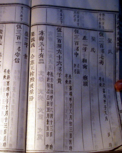 诸位请看,恒三百怎么有3人?这不符合一人一个排行号呵。我估计是后次修谱时,对从前谱册中不正确的地方修正之故。试想,一个宗族,几百几千人,都按照出生年月排队,每人一个号子是多么为难。有时某人年纪生日记错了怎么办,偶尔排错号如何修正?从插图页看出,恒三百号者有3人,是作了调整的缘故。先是名“七苟”者,他出生年月知道,有妻子儿子,因为有系图,所以不能变。而第二个名“中”者,大概过去谱上录了,但此次发现“系图无考”,估计搞错了,但为慎重起见,仍记上一笔。又第三个名“子贵”者。过去误排入66号,而照生于嘉靖甲子年,所以次序应编入300号后、301号前,就写了“恒三百称六十六”几字。在清朝嘉庆年间,来修正明朝嘉靖年间的事,只有如此做了,否则编号重新排列,全盘都乱呵了。修正还是不修正?我以为何春生这种做法是对的。