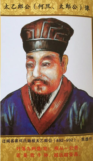 在此,要补充一个很特别的人,就是(892年至992年)唐进士,任福建宁化县令,升梅州太守,惠州太守,潮州刺史等职的何大郎。(见图5、6)何大郎后裔族谱的名称记载为何太郎、何泰郎、何亶等有十几种名称以上。为什么会形成这种奇怪的现象。其二、为什么何氏人口现在一千三百多万,何大郎后裔会有几百万(据说有800万、500万等,我估计人口应该有350万左右,希望撰修总谱能顺便人口普查得到一个精准的数字。)从中可见何大郎一族在何氏总人口占有分量之惊人的数量,从而奠定何氏人口占中国人口排列17名次的关键数。同时也显示出一个创造历史的伟大人物在历史长河的浑浊沙堆中掩盖不了的原因所在。何大郎的《遗嘱诗》是揭开许多谜团的指导依据,其内容用历史典故来喻义自身的经历、总结和强调人们团结、友善、创业,不忘根本。说《遗嘱诗》是发展高质量的人口战略理论思想、方针、筹划一点也不为过。做正自己、做大自己、做强自己,而成就实际正果,而不是高举屠刀,象唐未黄巢。争斗不是庐江何氏本色。庐江何大郎军政一体,勤廉善义不仅深刻影响了何氏后裔,也是直接溶入客家群体的优良品性,这品性,成为客家人在生活中有情有义,在劳动中具有硬劲,战争时期具备硬颈的特性!客家守护神定光佛祖在这千百年间孕育的“万佛”弟子不仅针对庐江何大郎后裔的保护,也是对客家群体的直接保护。何仙姑惩恶扬善,施医施药,镇邪扶正无不表现庐江何氏的精髓与活力!庐江何大郎后裔中出现有何仙姑、何执中、何天炯、何子渊……等历史人物无不体现家族成员与时俱进,为民生和国家命运肩负的责任。客家何大郎为庐江何氏辉煌的发展推向一个史无前例的高潮!