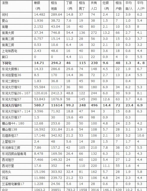 下面根据谱上资料,整理成表。以派于粮的1两银折合占有土地20亩计,以4钱为1男子计,以2钱为1户计(摊派每户每灶3钱,但我看不少为不齐户,所以平均每户2钱了),看看各村各派大致情况。