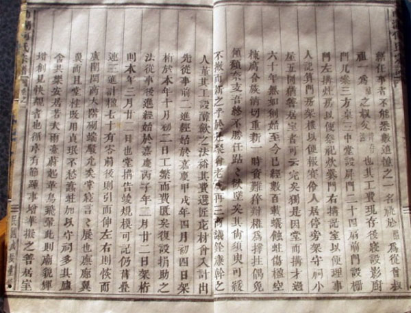 独是因堂而构,才过六十年。无如创始至今已数百载,蚁蚀蛀伤,楹空栋腐。合族情切重修,一时资难猝办,权为撑拄,偶免倾颓,奈支吾终不胜任,跕跕欲坠矣。其尚须臾可缓,不攍撤而新之乎。于是聚会老成,再三商议,铨廉干之人,董其工,设醵敛之法,裕其费,选匠庀材,会入计出。先从事前二进,经始于嘉庆甲戌年四月初四架桁,于本年十月初二工。繁而费匮矣,复设捐助之法,从事后进。经始于嘉庆丙子年二月廿二,架桁,则本年三月廿二日也。堂构告竣,规模可记,仍旧叠连三进,计楹七十有零,前后则引而伸,左右则恢而广,闬闳高大,降砌端严,允矣堂寝,言言展也,庑廊翼翼。而且堂柱改用贞珉,不愁蠧蛀。加以守祠多其庐舍,共乐安居。若夫雨台蔚起,革鸟飞翬,此则庙貌辉增,创见快睹者也。循序有节,踵事增华。拟之善居室者,亦庶几富有而可曰,苟美矣。记之如右。