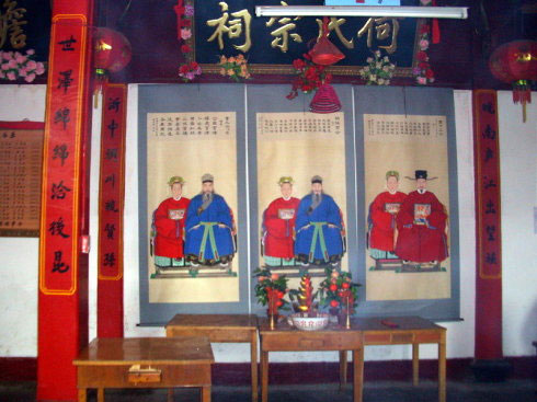 2006年冬官清何鸬子孙修了新谱,以巧二公何容派下为主,我村没有参与。老祠堂修缮一新,画了几幅先祖图:中间是始祖何京夫妇,其左手侧为万十三公何恪夫妇,右手侧为重三公何鸬夫妇。图像格式基本统一,都是画师模仿官家富绅所作,富丽堂皇,雍容华贵。我想,与真正实际可能相距甚远,但能满足百姓崇拜也。