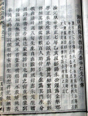 看《南湖何氏宗谱》卷15中8世中排行棣六公者,单名“仁”,说是“新屋祖”,即后来称为官清畈村的始祖也。该行传无生卒及妻名,但以稍小字注着,“山阴分教称仲仁先生详见本传”。对此传记,我十分怀疑,认为牵强附会张冠李戴了。此何仲仁先生,非官清何仁也,让我们看了原文再说吧。