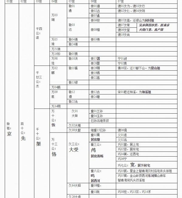 再看第4、5、6世各人行传。第4世共11人,除1人外都有生年。第5世16人,除3人外,都有生年。第6世22人,都没有出生年份,只有1人叫何鸣的有生年(是后来推测出来的吧,我存在疑问)。另外从行字编排来看,何梁和何杰后代第5世取敬字,第6世取崇字。而何榘后代第5世取久字,第6世取重字。其原因可能是何梁何杰系同母所生,所以关系较密。而何榘与两兄虽然同父,但不同母。