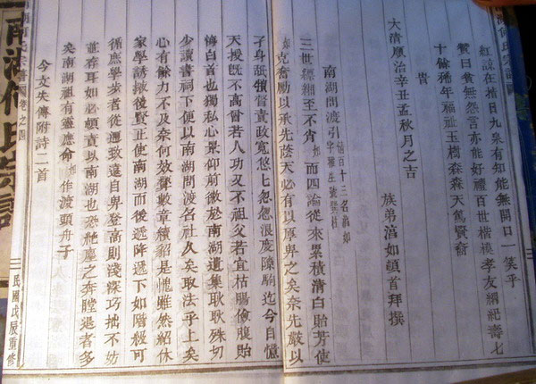 淳如有几篇文章原来刊登于谱,总题目为《南湖问渡》,可是不知什么缘故丢失了——很可能是洪楊之乱。现仅存《引》,并说他自己是“渡头舟子”。