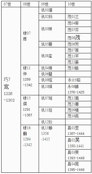 表格里面内容,编号数字前为行字,数字后为名字。名字后数字为生卒年,从中可见只有少部分人有出生和逝世的日期。发现大部分缺少生辰的人,其后代先后断绝。还有9世13人行字统一,号码连续。但10世就不统一了。8世老大何傅与老三何僎的孙子都用茂字排行。老二何仲的孙子1人用茂字,2人用永字。老四(或称老小)何佾孙子都取昌字。再从编号数字看,茂字编号到22,但其中14、15、17、19、20号缺失。永字编号只有5、6,前面1、2、3、4号缺失。至于为什么,我认为这些缺失号码者,知道有过其人,但连姓名都想不起。如知道某某有两个哥哥,但叫什么不清楚。如此排号时,先留着,可是后来仍然想不出,于是先次修谱时空着,后次修谱则删去了。