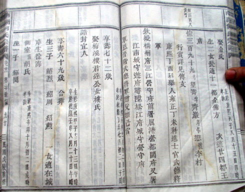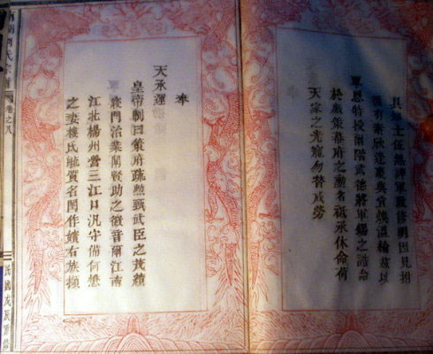 我族家谱中套红印着皇帝封诰的,只有3人。一是20世东河人何士升,荣誉衔荣禄大夫,最高级别广西平乐府副将,相当于军分区副司令员吧。二是20世何氏头村人何懋,武进士出身,荣誉衔武德将军,最高级别松江府营守府,相当于地区级警备司令吧。三是25世东河二房何震,武举人出身,福建漳州府千总,转台湾府北路淡水千总,相当于团级或副团级吧。他们都是清朝康雍乾军人,级别仅是中下,可是频频予以嘉奖,想来清廷一反明朝重文传统,而是推崇武力也。