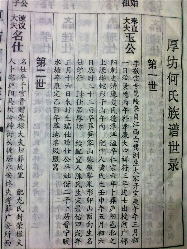 因为吾燕泉堂鼻祖孟春公确实于大明嘉靖十六年(1536)已经去世,所以有人据此认为此谱序是攀附名人,是造假之作。我个人认为这未必就是造假。因为在谱序中有两句话:“寒舍鳞居鲁塘简藓不一,愧未追随先生,常相亲炙,使少长皆有矜式。因念族谱迟久不修,则代远年湮,支分别派恐难就正,今欲循枝以推其本,临流以遡厥源,俾十世余宗祊(bēng)朗然如纲之在纲,有条不紊。长兄其肯出一言以弁(biàn)诸首,则重增九鼎矣。”、“此日也二弟唯唯而退。予是乎书。”从这两句话中可以看出德凤德仪两弟兄对孟春公是非常尊重和推崇的,而自己表现得很谦卑,如果不是事实,不论古代现代有谁会在人前如此自我贬低呢?况且当时家谱也不可能只有一套传诸后世,谁会闹这样的大笑话呢?当然,文中时间误差确实存在,我认为这是清光绪九年癸未(1883年)续修甲申谱时刊刻错误,查孟春公生年之明朝皇帝践极达二十一年以上者惟嘉靖帝,应该是把嘉靖二十一年错刻为万历二十一年了,这篇谱序是德凤德仪二公在孟春公去世前托其所写,后来成谱时孟春公已经去世了。众所周知,古代一套家谱从倡议修谱到成谱发行是要经过很多复杂的工序的,历时往往会在数年甚至于数十年,但多项工作是可以同时进行的,且谱中并没有说成谱时德凤德仪二公尚在人世。同时从文中也可以看出孟春公称呼为宗弟,说明孟春公或者说德凤德仪二公是认可聘仲公支系和浚明公支系是同族同宗的。而《厚坊何氏族谱》中则明确聘仲公是玉公次子学仕公之后,孟春公为汝城何氏所撰的《怀普公传》中所写的“吾与公同乡且连族”则表明孟春公是认可汝城何氏玉公裔孙怀普公和大塘何氏是同祖同宗的。而经过多方查证,大塘何氏是玉公长子名仕公裔孙荣十三郎之子知亮公之后,这也说明了大塘何氏和鲁塘何氏是同祖同宗的源流关系。
