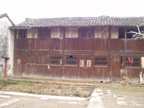 首先是重建住房。现在我家及附近的老房子,据说就是长毛造反后重建的。结构如“冂”形,开口朝南。北面是堂屋3大间,下图为2006年10月所拍照片——其时恰有村民某去世,安葬前有军乐队演奏,我站于老屋楼上拍照,其中点着红腊烛的就是堂屋。堂屋东西两侧各7间,大部分为悦坡兄弟所重建。30多年后悦坡逝世才分家,东面7间楼房(白墙右边两间没照进)靠北4间分给哥哥悦堆的子孙(加后面附房3间),靠南3间分给弟弟悦培子孙(加后面附房3间)。而我们悦坡的子孙,分到堂屋西面靠南3间(加周边茅屋和菜圃)。