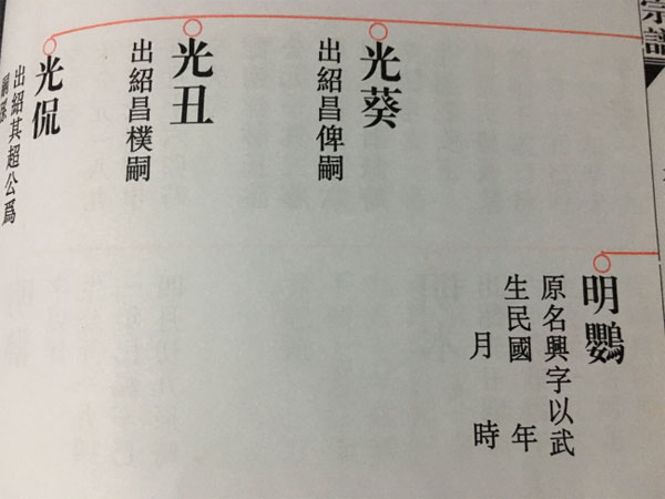 何光黁是中国福建省福鼎市秦屿镇太姥洋村人,生父何昌鈺,生母陳氏,光黁出生于公元一八九六年五月十六卯時,若健在121岁,家中有四个兄弟,分别叫光葵、光丑、光侃,他是大哥,因生活在农村山区家境贫寒,他为了支撑家中光景,改变家人生活,他同叔叔昌樸以及村中族人一起,从厦门坐船飘洋过海,去了当时的南洋。做苦力与包工头多年,并开店做起生意。后来又娶南洋女子林氏为妻出生于公元一九二零年六月二十日辰时,并在南洋养育三男三女,分别名叫:大伯明淋(字以洋,出生于公元一九四一年四月初九辰时,今年76岁)二伯明木、三伯明鸚,姑姑:秀兰、秀珠、秀英。我们何氏家族的辈份排行是:奕、世、其、昌、光、明、正、大。
