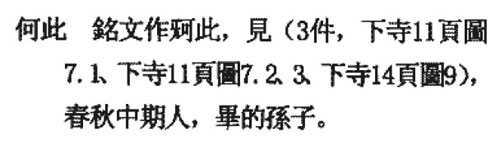 “何此,铭文作<旡可>此,见(3件,下寺11页图7.1、下寺11页图7.2、3、下寺14页图9),春秋中期人,毕的孙子。”