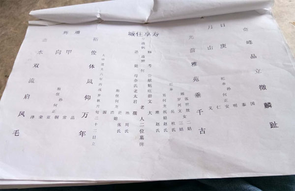 〈坪头〉,何氏支系,因年代久,一切实物资料都遗失,现在证实的只有碑文及口头传说,口头传说至今每年祀祖(偏房),腊月大二十九日,月小二十八日烧纸,说:破锅三块,三房每房一块,使今后相认亲人,二十字辈转宗,澄其朝文玉,魁龙正邦廷,长春思宗祖,永远大国民。