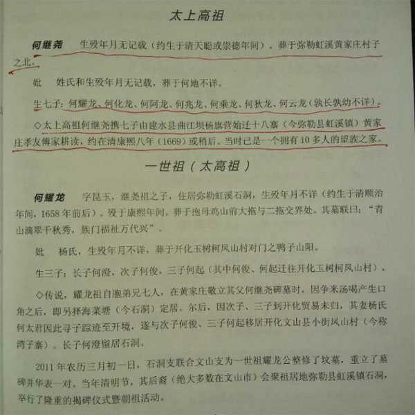 耀龙公,妣杨氏,生何澄何俊何起三子。杨氏随俊起二子移居开化玉树柯凤山村(文山市小街镇湾子寨)。