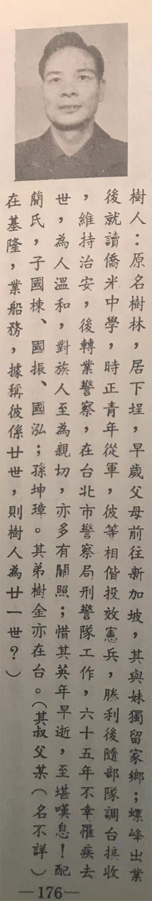 在1942二战前夕曾祖父母迁往了新加坡。祖父(1922年生)在福建曾就读侨光中学,后正值青年投入军旅抗战,与叔公迁往了台湾生活,还有未见过的姑婆在福建惠安生活。 辈份排序是曾祖父何志诚殁于1943年新加坡、祖父 何树林(后改名树人)殁于1965年台湾、第二代出生台湾何国泓、我是台湾出生的第三代坤字辈,感谢协寻祖先,如有相关消息感恩分享。