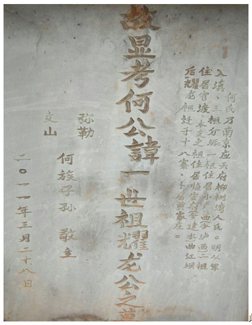 1、红河州弥勒县虹溪镇海菜塘何耀龙祖墓志载明:何氏乃南京应天府柳树湾人氏,明从军入滇,三祖分派,一祖住居小广西,二祖住居官渡,本支之祖住居临安府(今建水)曲江坝,后耀龙祖迁于十八寨,卜居黄家庄。清康熙壬申年,耀龙祖由建水曲江坝迁居十八寨耕读,与杨氏太君育有三子,澄(chéng)、俊、起。俊、起贸易开境,母亲杨氏寻子踪迹至开化玉树柯为家焉。长子何澄与赵氏育有四子,长子有财、次子有银、三子有富随祖母移居开化,四子有贵留居石洞,子孙世守迄今。文山支耀龙祖后裔至二零一零年已繁衍到近六百多户,二千四百多人。主要分布在文山土库房、新街湾子寨、摆衣寨、文山城区以及马关喜主、古林箐等地。石洞支已繁衍到第十四代根字辈,共五十多户,二百多人。