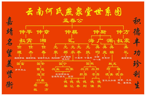 对于红河弥勒、文山何氏究竟是不是先祖孟春公后裔这个关键性问题,我在两地考证返回罗平后又多次电话与两地宗亲讨论沟通。弥勒石洞支系何文道老宗亲分别在2018年8月22日13点22分至8月24日22点44分多次打电话声明他们遵从祖上所说,认可何孟春就是他们的先祖,声称十八寨祖上流传何耀龙的父亲就是何继尧,要求在《燕泉何氏族谱》中将石洞何有贵祖这一支何氏源流世系根据我们的要求全部编入家谱,修正盘州何氏前编族谱中出现的错误,谱成之后带给他们。文山支系何朴清老宗亲在2018年12月24日上午9点30分电话回复对于神主坟的历史已经无法搞清楚,声称没有精力继续上溯到何孟春这一代,并决定临时召开家族委员会确定是否是孟春公后裔。后于当日12点23分最终由何朴清老宗亲代表文山何氏支系表态说明由于他们刚刚于五年前修有家谱,世系追溯到何耀龙祖这一代,其以上世系已无任何传世资料,如再次修谱恐会增加族人经济负担,故决定不再参与罗平燕泉何氏及贵州六盘水何氏修谱,但是决定由燕泉何氏将其支系源流写入《燕泉何氏族谱》源流传说之中,给后世子孙留下一点信息,便于后世子孙寻根合谱,并根据各方意见同意弥勒何文道支系与罗平支系合修家谱。其后文山何源成宗亲在8月25日21点12分电话表态服从家族委员会几个老人的决定,在燕泉何氏族谱中只把孟春公至耀龙祖几代信息及当前家族负责人信息整理清楚写入谱中,作出详细说明,并将其本人这一支系写入《燕泉何氏族谱》,出书后带两套给他留给孩子保存。经我再三思忖,尊重文山何氏宗亲的选择,只把本文编入《燕泉何氏族谱》源流存真部分,不再对该支系做其他记录,另外把石洞何文道支系和平坝何源成支系按照祖传信息全部编辑入《燕泉何氏族谱》弥勒、文山支系内,其他支系不再赘述。