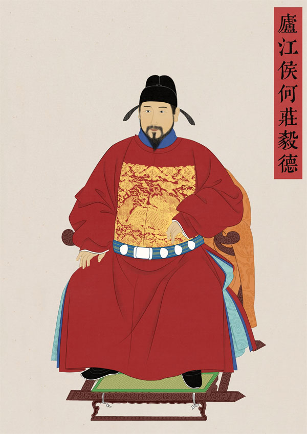 明成祖朱棣继位以后,列出一份功臣名单,被称为《明初功臣表》。在这份长名单中,共出现一百五十位功臣,其中公爵二十五位、侯爵七十九位、伯爵十二位、子爵十一位,以及男爵二十三位。何德位居侯爵前列:“庐江侯何德,洪武十四年七月卒。追封,谥壮敏。”