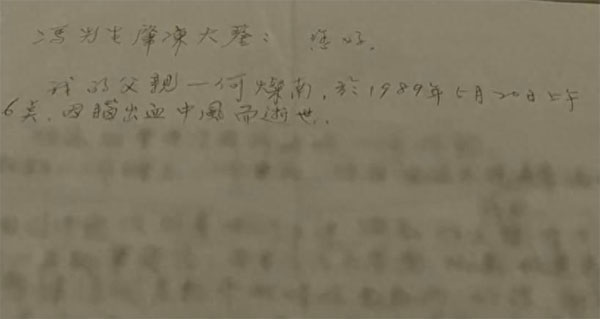 “我的父亲何灿南于1989年5月20日凌晨6点因脑溢血、中风去世。”