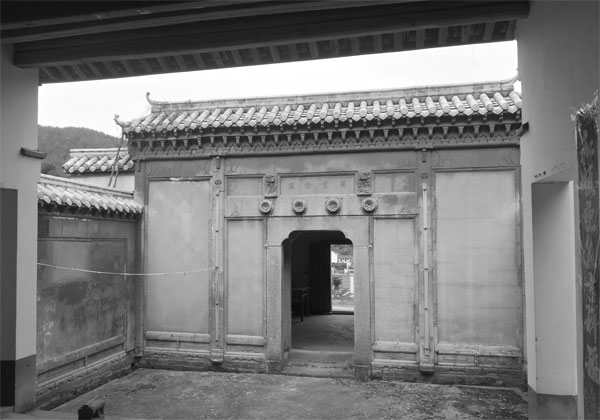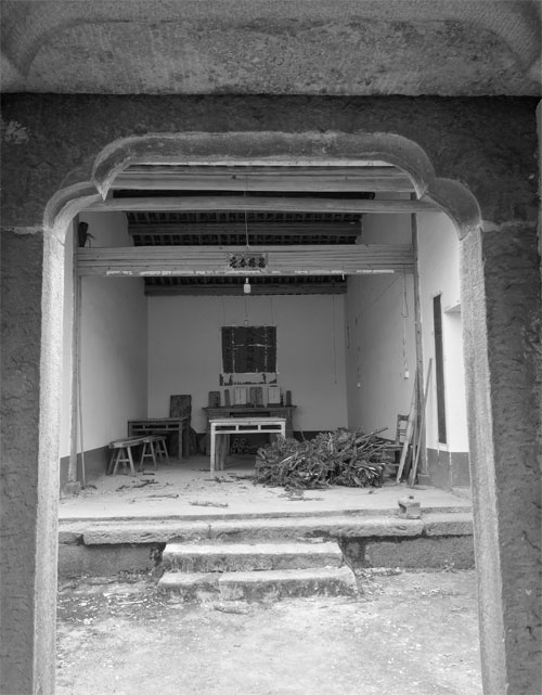 照理说,这深宅大院的大门应该是石库门,想来是在时代的变迁中改换了门庭,特别是改革开放后,国门大开,迪斯科等所谓的西方文明曾经盛极一时。风雨洗礼,时光浸淫,人们更尊重到中国传统文化的深邃博大,先辈的劳动创造在人类灿烂辉煌的星河中最耀眼夺目,现代的基因技术如果离开的族谱,寻找渊源又该从哪里理出头绪?祖堂便是这些文化的最好寄托的藏台。门头的水泥砖墙与木质门框大概是今人修缮所为,这并不是历史的本来面目,更何况二进厅门就是石门,门栓的石洞与户枢的孔眼尚在。我立于门首远眺,青山相对,良田千顷,小楼林立,世居静安,山水清幽。