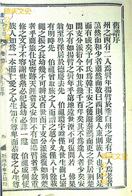 若佛果翁①至粤,择居于德庆,去先伯祖琼宇翁②仅九世,生齿已繁。有明时,先伯祖曾取族之人而谱之,越今又仅八十余载,绳之振之,长幼几不可辨,况百世而下,支分派远,复如荆楚者乎?商旅仕宦,寄迹天涯者,又安知不有如扬臂者乎?故重修之文,予不容谢,世系必纪,长幼必详,一遵伯祖成例,使族人知为一本,而仁爱之心生,知有尊早,而恭敬之心生,尊者俯而教,卑者仰而受,中与不中,才与不才,均抵于蔼然而和,肃然而敬而后已。斯老老幼幼,恤贫赈灾之道,可次第而兴举也。然而三代以前,族未有谱,而九族咸睦;三代以后,族渐有谱,而角弓兴怨。果其知修谱之意,而后谱可修也。否则,修与不修奚异?