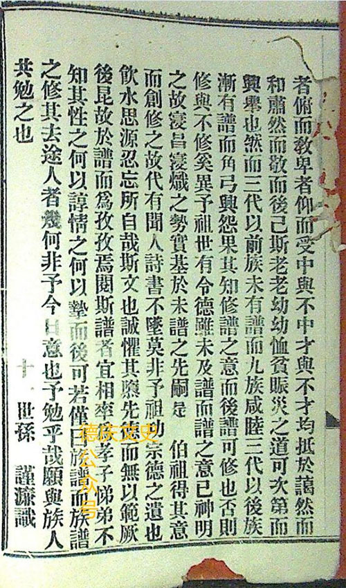 予祖世有令德,虽未及谱,而谱之意已神明之,故寖昌寖炽之势,实基于未谱之先。嗣是伯祖得其意而创修之,故代有闻人,诗书不坠,莫非予祖功宗德之遗也。饮水思源,忍忘所自哉!斯文也,诚惧其隳先德而无以范厥后昆,故于谱而为孜孜焉。阅斯谱者,宜相率为孝子悌弟,不知其性之何以谆,情之何以挚而后可。若仅曰族谱,而族谱之修,其去途人者几何?非予今日意也。予勉乎哉!愿与族人共勉之也。