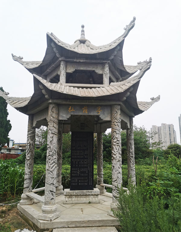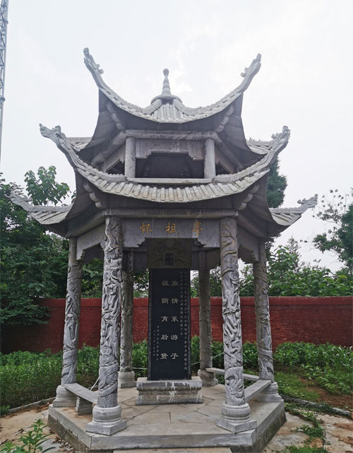 虎石岩边携玉魄,凌霄树下舞蛟龙,百年如梦故园红。