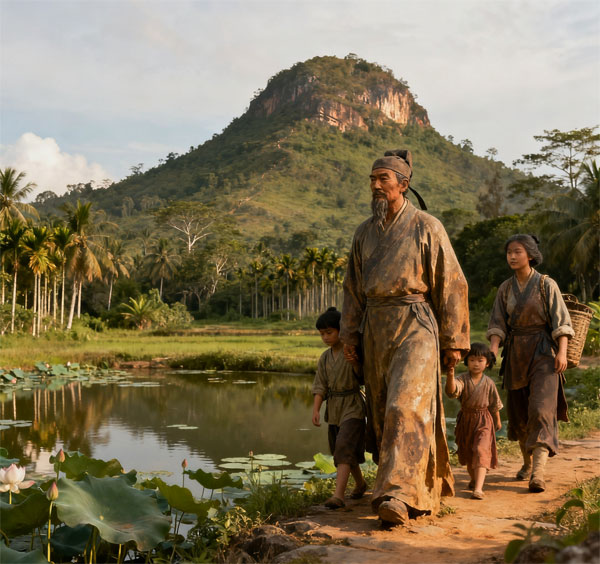 何仁德登临山巅俯瞰,见山间云雾缭绕时,仿佛有仙人自岩壁洞穴中缓步而出,心中豁然开朗:“此乃‘仙人出洞地’!坎山离向,东水南流,仙桥为案,正是天地馈赠的吉穴。”他当即嘱咐妻儿,自己百年后便葬于此地,借仙洞灵气护佑家族兴旺。相传他选定的墓穴位置,夜气护佑家族兴旺。相传他选定的墓穴位置,夜间常有莹光闪烁,莲塘中荷花四季不败,即便大旱之年也池水充盈。