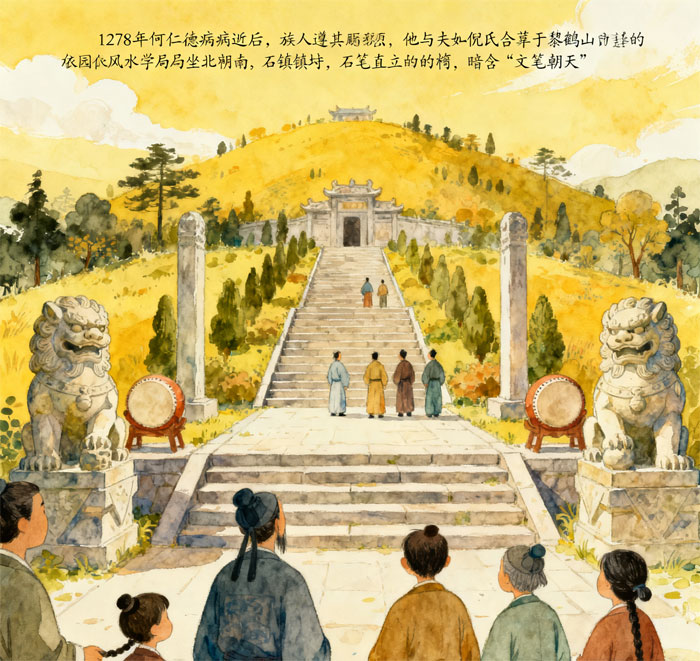 1278年,何仁德病逝,族人遵其遗愿将他与夫人倪氏合葬于黎鹤山。墓园依风水格局坐北朝南,神道拾级而上,石狮、石鼓镇守两侧,石笔直立如椽,暗含“文笔朝天”之意,盼后世学子金榜题名。奇特的是,守墓人梁氏家族世代在此居住,村中老人说,凡在当地祈福做法,必先向何公墓焚香告知,否则诸事不顺,足见此地灵气之盛。