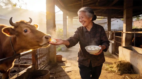 晨早去村头买豆腐,可见邻家阿婆端一碗汤圆走向牛棚。老黄牛闻声抬头,温顺的大眼映着晨光。阿婆将汤圆置于掌心,递至牛嘴边:“辛苦一年,你亦过冬。”牛舌粗糙的触感掠过她手纹,她脸上绽开的笑容,比任何祭祀时的神情更生动自然。