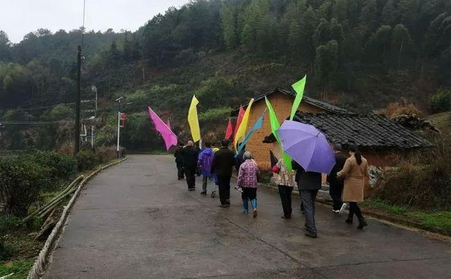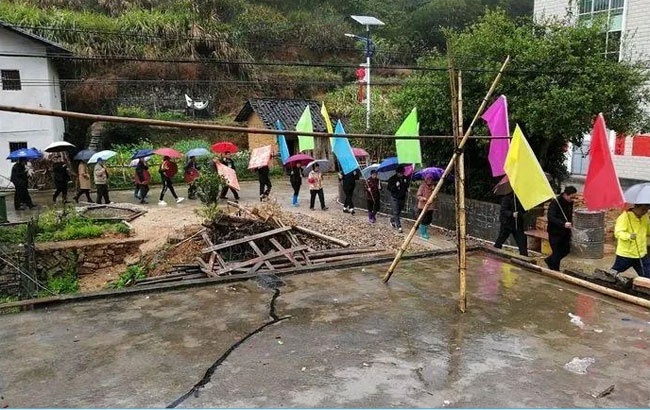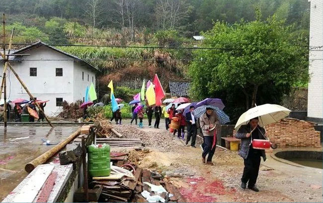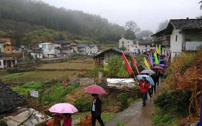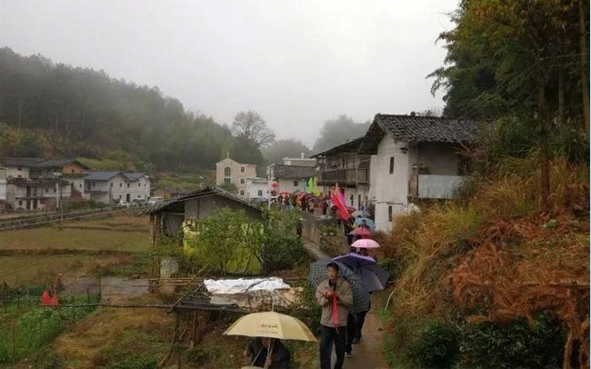 在雨丝飘摇中,伴随锣鼓和鞭炮声,子叔们前往开基祖守宇公墓献香火,以虔诚的方式缅怀先祖。他们挑起罗格,肩上还揽着鞭炮,步伐有序地朝开基祖守宇公墓前行。