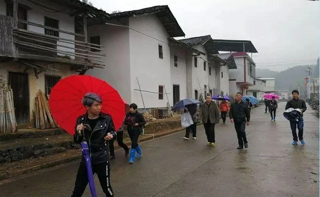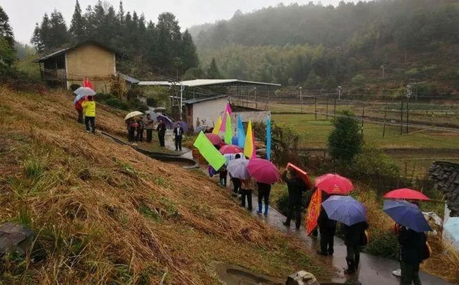 上午9时,子叔们在坳头坪何氏墓园附近集合,准备在雨中进行祭拜仪式。此时,雨水充沛,他们纷纷撑起雨伞,整装待发,按照预定的顺序站好。