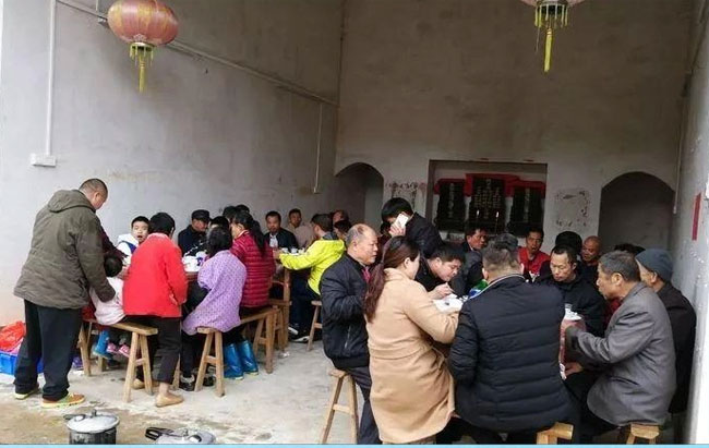 祭拜结束后,何氏子叔们前往新修祠堂欢聚,共庆佳节并叙说宗族情谊。他们井然有序地前往蓝源村的何氏祠堂,这处祠堂是近年来新近修建的,其旧址为何氏谱记中的“老何屋崇正堂”。在祠堂内,他们欢聚一堂,共进午餐,畅聊家常,共同叙说宗族情谊。