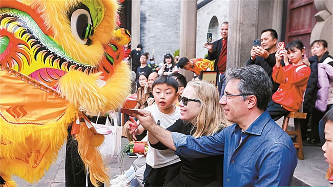 沙湾古镇留耕堂内,游客参与醒狮采青