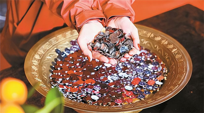 “聚宝盆”盛满硬币,捧银寓意新一年财源广进
