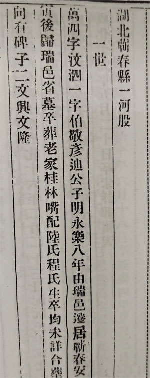 我们不妨看一下民国十年《庐江郡何氏大同宗谱》之族纪篇:湖北蕲春县一河股。如图
