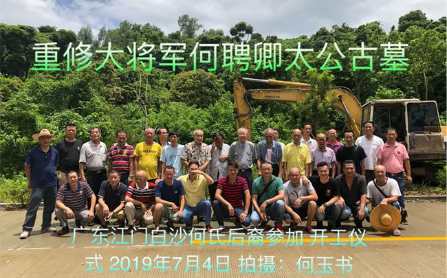 今年7月4日农历六月初二,广东江门市白沙何氏宗亲现场举办“重修大将军何聘卿太公古墓”开工仪式。墓穴:长20米、宽20米,总面积为400平方米。并按宋代墓制设计方案、设计图案实施。