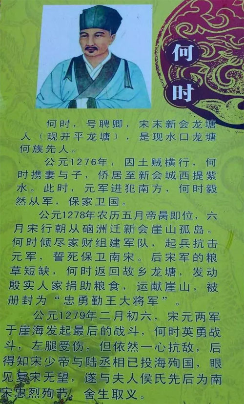 何时、字礼朝、号聘卿,广东开平龙塘何氏五世祖。岀生于宋端平三年,公元1235年5月11日,终身于祥兴二年,公元1279年9月17日,享年45年。南宋帝昺迁广东新会崖山,聘卿太公倾资练勇,涕泣誓师,被南宋朝廷封为“忠勇勤王大将军”。当时兵败归、图后举、宋朝亡。并与当朝夫人候氏先后为宋朝忠烈殉节。太公死后,被部卒寻回,葬于广东新会会城北石涧狗眠岗山腰。