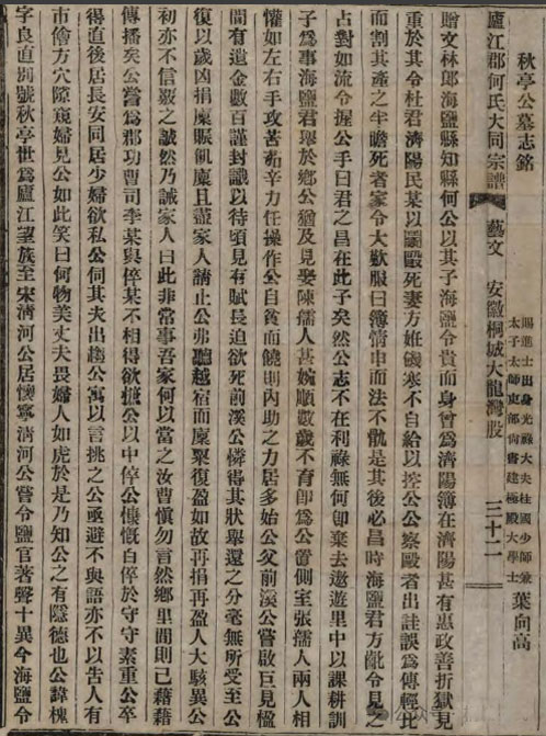 公讳槐,字良直,别号秋亭,世为庐江望族,到宋清河公居怀宁,清河公尝令盬官,著声十异。今海盬令复以循良著,盖源流于先世远矣。自清河公至前溪公凡若干传,前溪有五子,槐其季也,生于正德庚辰年十二月初九日,卒于万历辛丑年六月初二日,距所生得八十有二。陈孺人嬴其九,张孺人殺其十三,皆登上寿。子二:长早,即海盬君,癸丑科进士。次杲,光禄署丞,俱张孺人出。海盬娶陈处士鹏女;继张户侯濂女,赠封俱孺人。光禄娶聶诸生儒女,继杨处士锦女。女二:一适诸生陈时通,陈孺人出。一适诸生洪纶,张孺人出。孙大任邑庠生,杲出。大受,邑庠生;大蕃,邑庠生;大震,邑庠生;大望、大对、大猷,邑庠生,俱早出。曾孙如林,皆国器,未悉记载。公与陈孺人合葬西冶塘,张孺人附葬龙井坂。