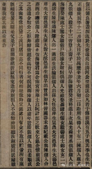 时海盬君方龀,令见之占对如流,令握公手曰:“君之昌在此子矣!”然公志不在利禄,无何,即弃去,遨游里中以课耕训子为事。海盬君举于乡,公犹及见,娶陈孺人,甚婉顺,数岁不育,即为公置侧室张孺人,两人相欢如左右手,攻苦茹辛,力任操作。公自贫而饶,则内助之力居多。始公父前溪公尝启巨,见楹间有遗金数百,谨封识以待,顷见有赋长迫欲死,前溪公怜得其状举还之,分毫无所受。至公复以岁凶捐廩赈饥、廩且尽,家人请止,公弗听,越宿而廩粟复盈如故,再捐再盈,人大骇异。公初亦不信,覈之诚然,乃诫家人曰:“此非常事,吾家何以当之?汝曹慎勿言。”然乡里间则已藉藉传播矣。