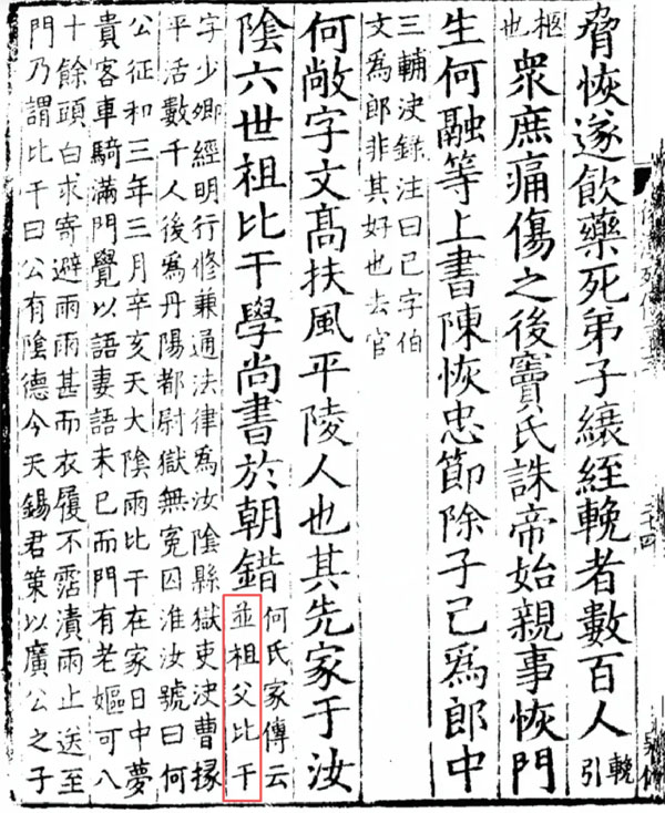 百纳本《后汉书》何敞传 李贤注:《何氏家传》云:并祖父比干,字少卿……