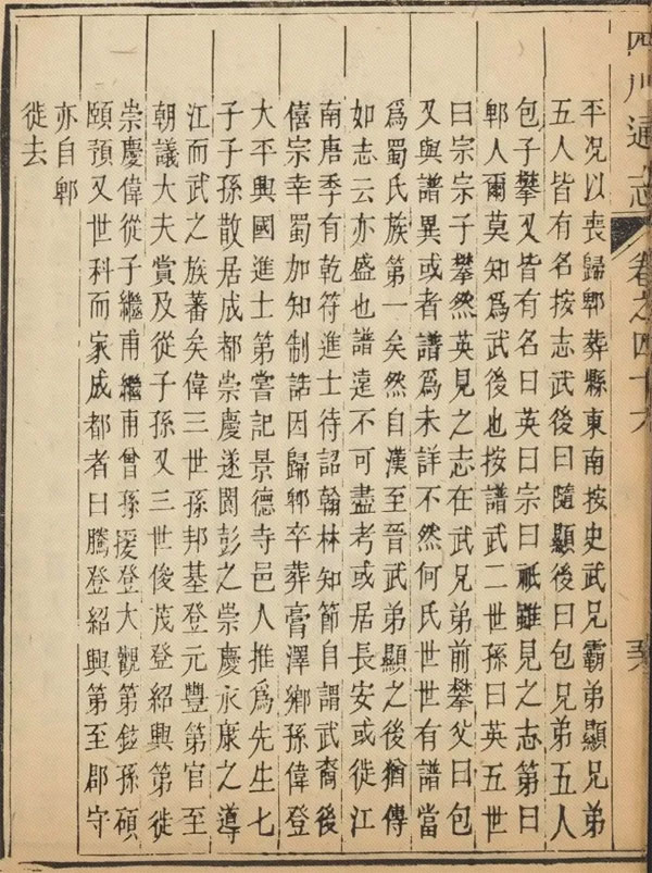谱远不可尽考,或居长安,或徙江南。唐季有乾符进士、待诏翰林知节,自谓武裔。后僖宗幸蜀,加知制诰,因归郫,卒葬膏泽乡。孙伟,登太平兴国进士第,尝记景德寺,邑人推为先生。七子,子孙散居成都、崇庆、遂、阆、彭之崇庆、永康之导江,而武之族蕃矣。