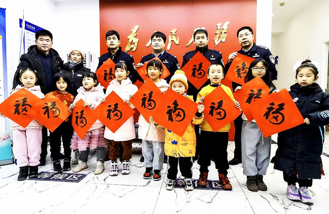 现场墨香四溢,喜庆祥和。书画院何涛老师讲解了春联文化与书写技巧,并示范创作。在其指导下,居民与青少年们提笔书写,将新春祝福与对公安干警的感谢融入笔墨。一幅幅春联和“福”字完成后,被真挚地赠予到场干警,温馨互动洋溢浓浓警民情深。