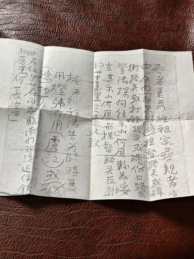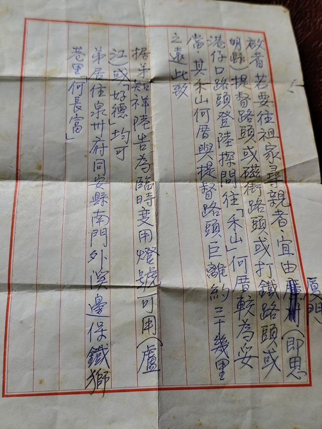 信上寫:如果要往祖家尋親,宜由廈門提督路頭或磁街路頭或打鐵路頭或港仔口路頭登陸探問往(禾山)何厝較爲妥當,其禾山何厝與提督路頭距離約三十幾里之遠。據弟知祥陸告為臨時便用燈號可用(盧江)或(好德)均可。