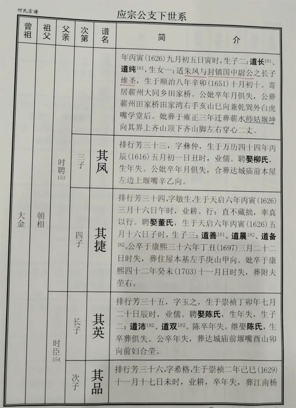 何应宗→何仕隆→何江→公昱→伯滨→大金→朝相→时聘→其凤