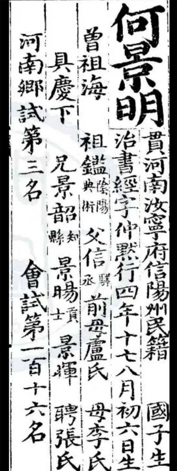 何先生,讳景明,字仲默,号大复山人。先世湖广罗田县人。四世祖太山,红巾乱时徙信阳,遂世为信阳人。太山生四子:隆一、隆二、隆三、隆四。隆二,一名海,先生曾祖也。生祖鉴,为典术。有阴德,称于乡里。鉴生父信,驿丞,后封中书舍人,博学能诗,号梅溪。公生四子,先娶卢夫人,二子,长景韶,成化丙子举河南,历官东昌府判,先卒。次景旸,弘治戊午与先生同中河南乡举,见官安庆府通判,后娶李夫人,子二人,长景晖,不仕。次即先生者也……